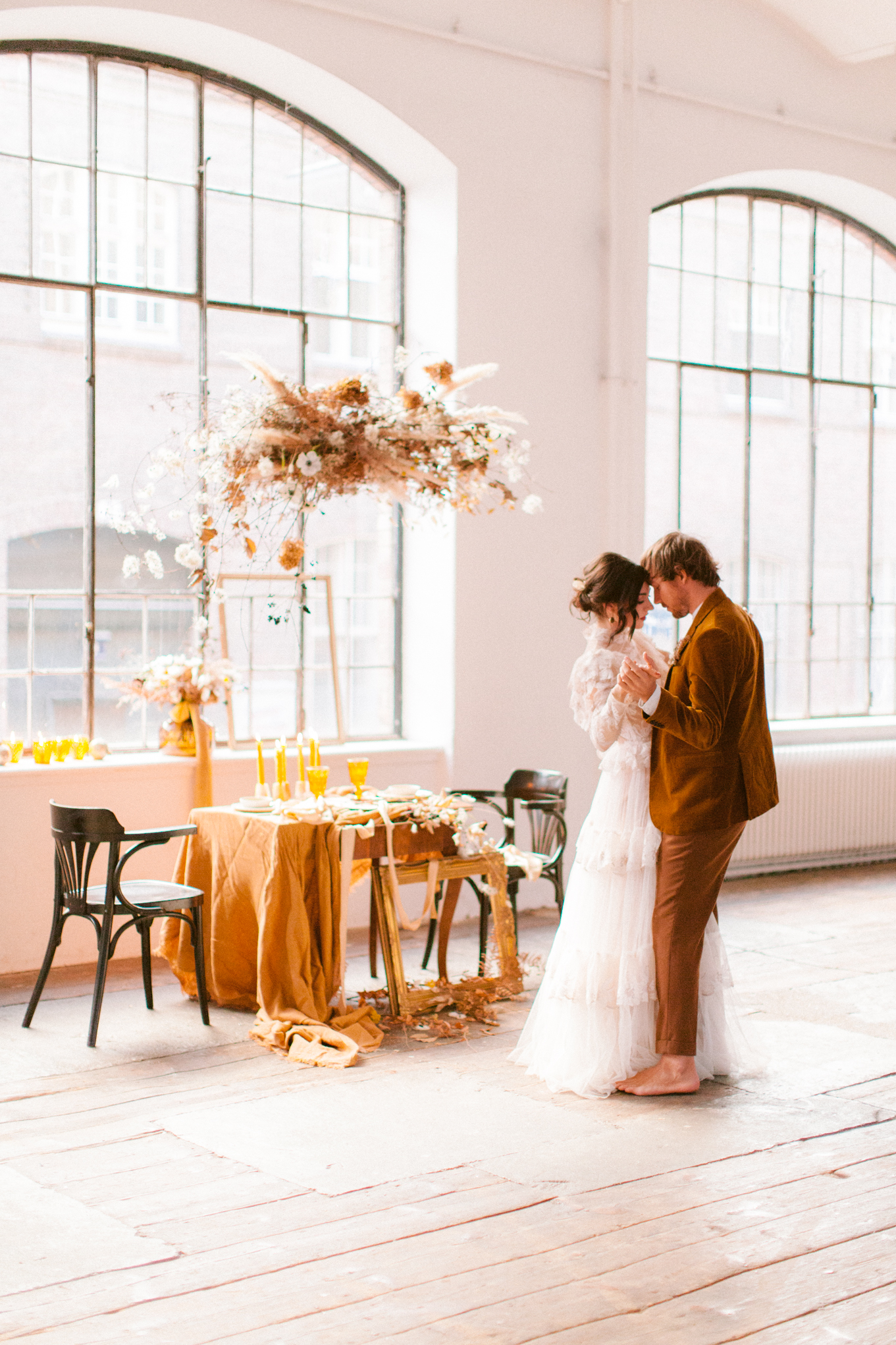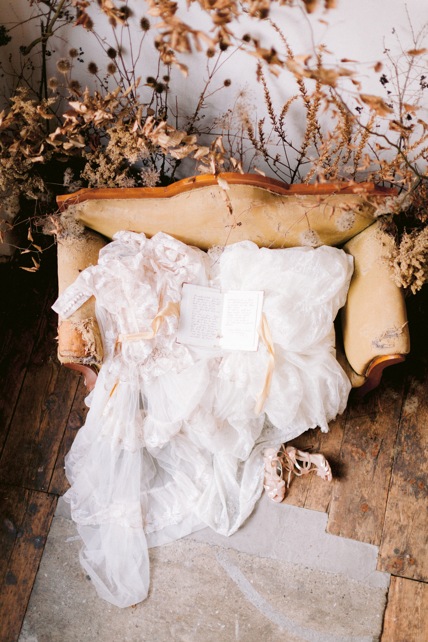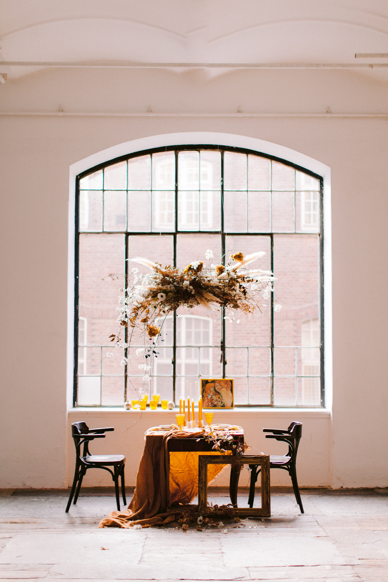 Es scheint, als hätten die Musen auf sein Erwachen gewartet. Der Tisch ist festlich gedeckt, die Einladungen versandfertig, der Hochzeitsbogen in voller Trockenblütenpracht. Bereit für das Fest der Liebe, zum Gedenken an Klimt.