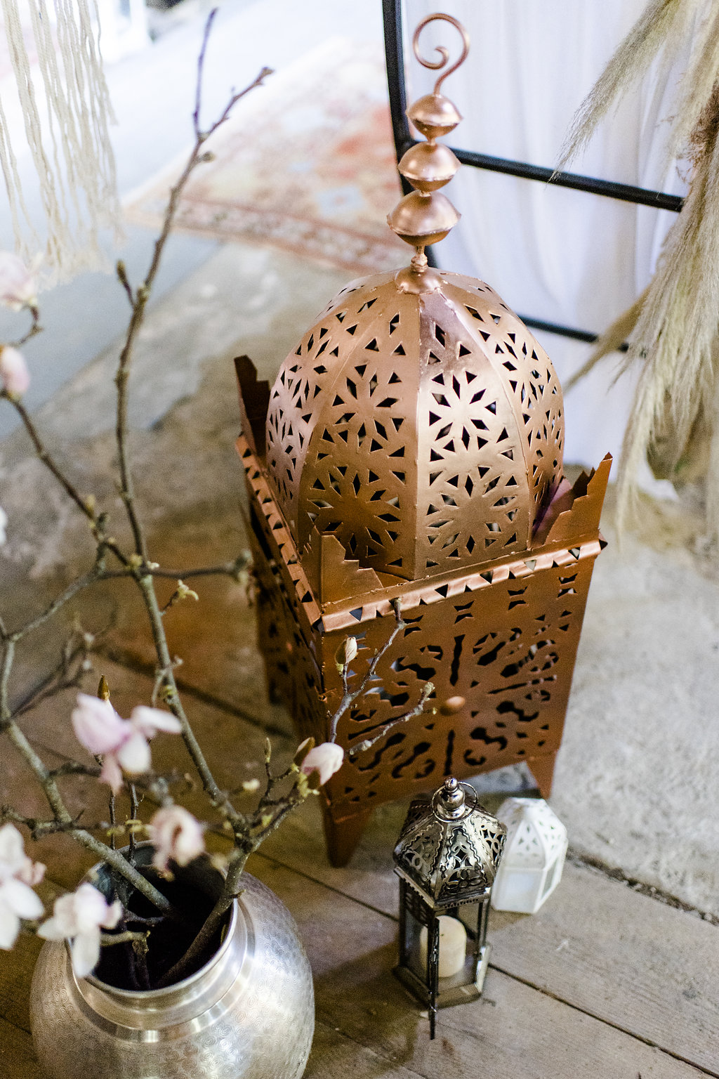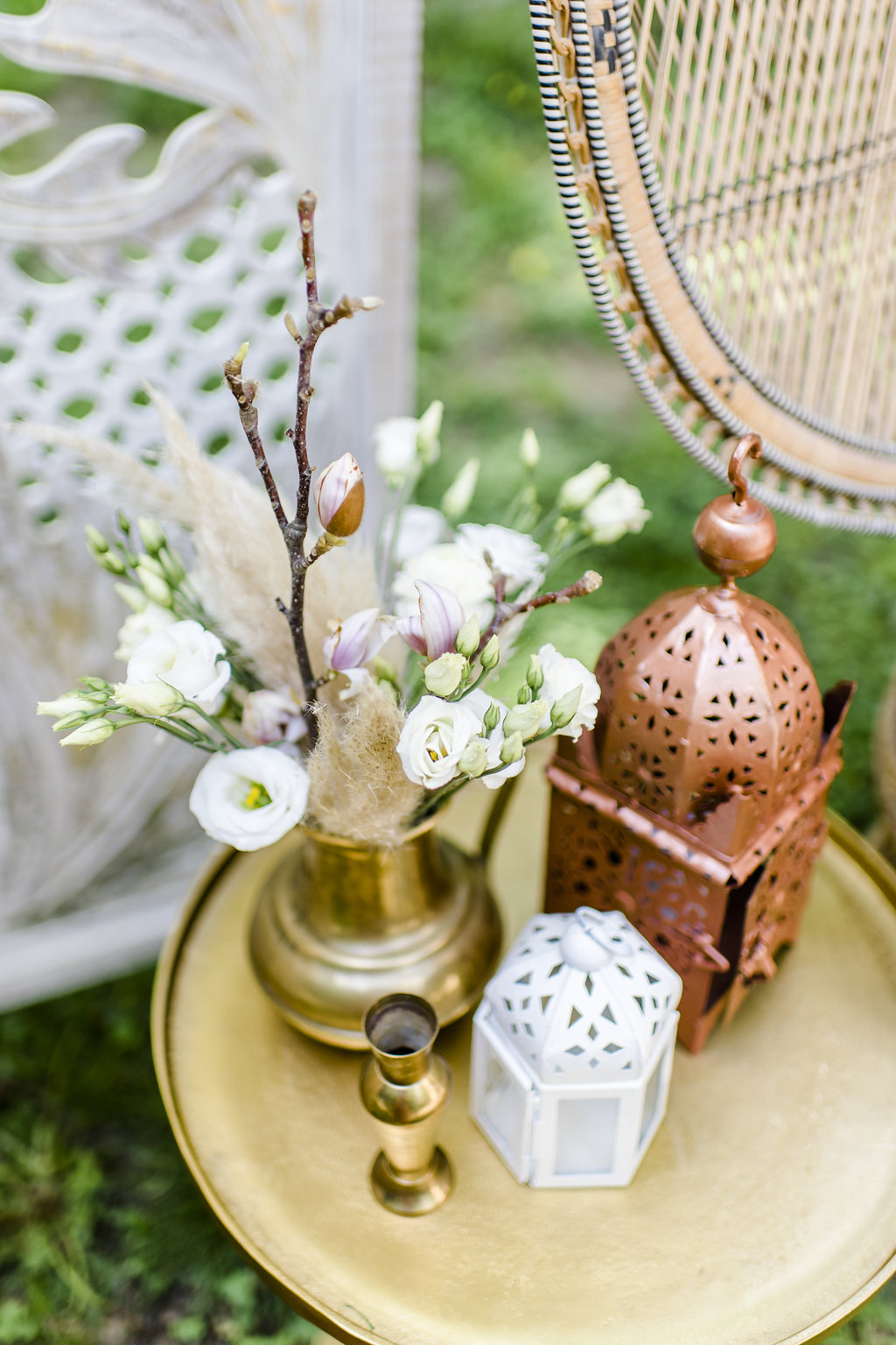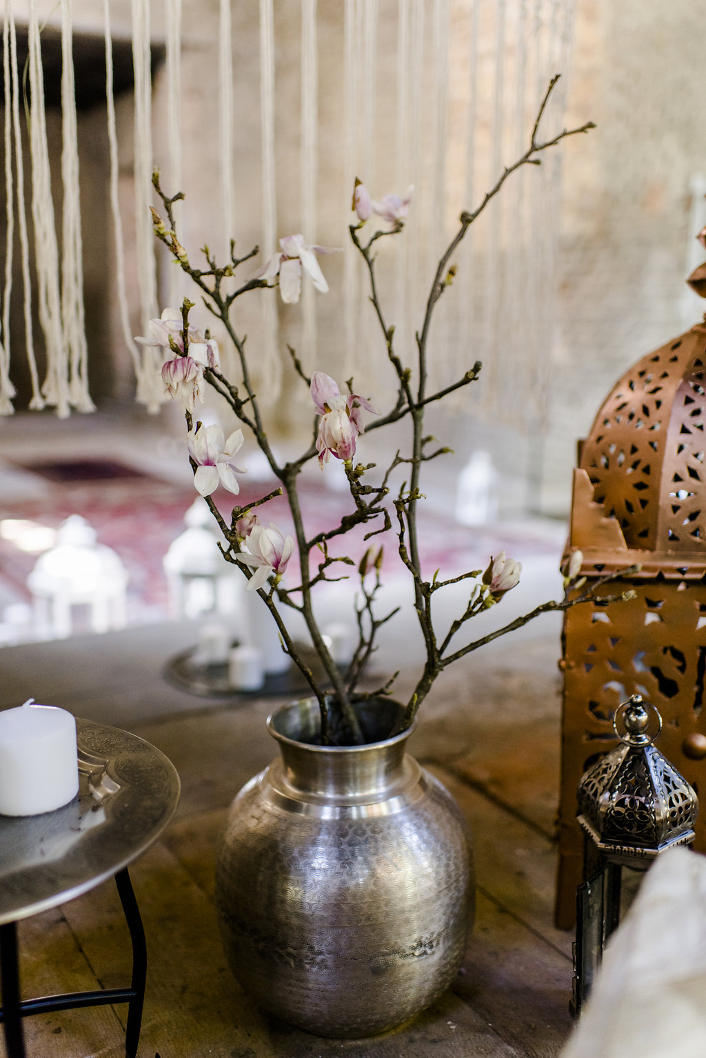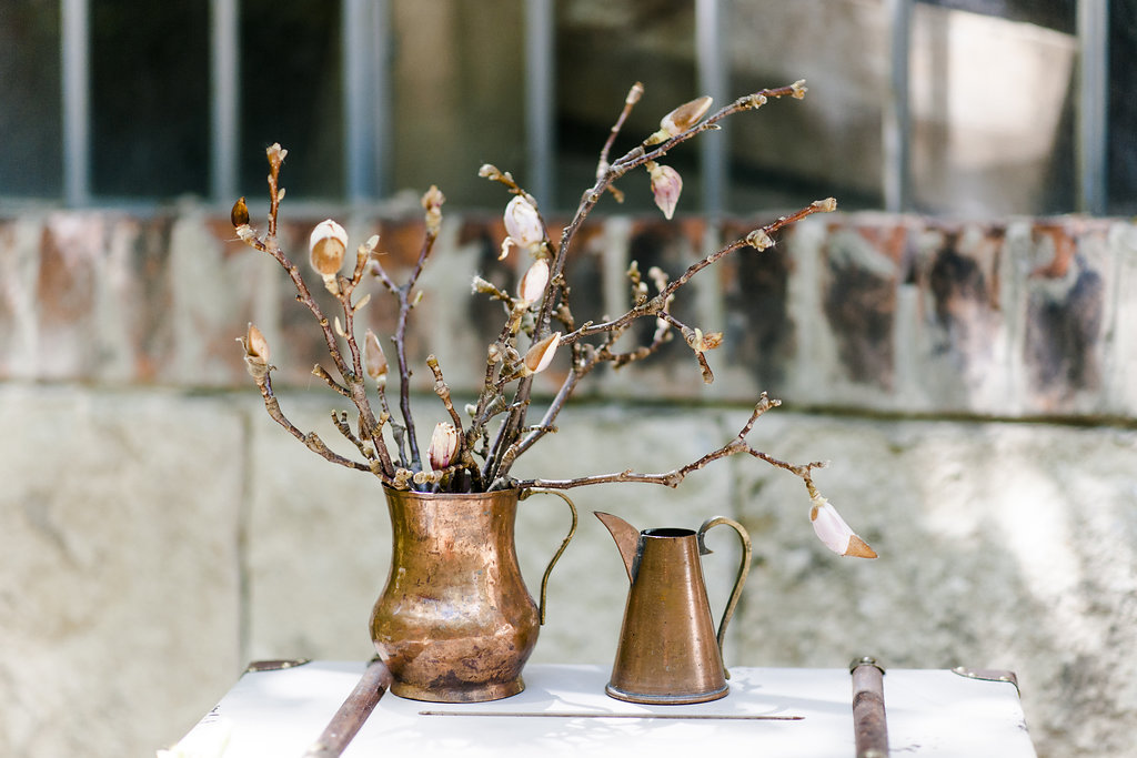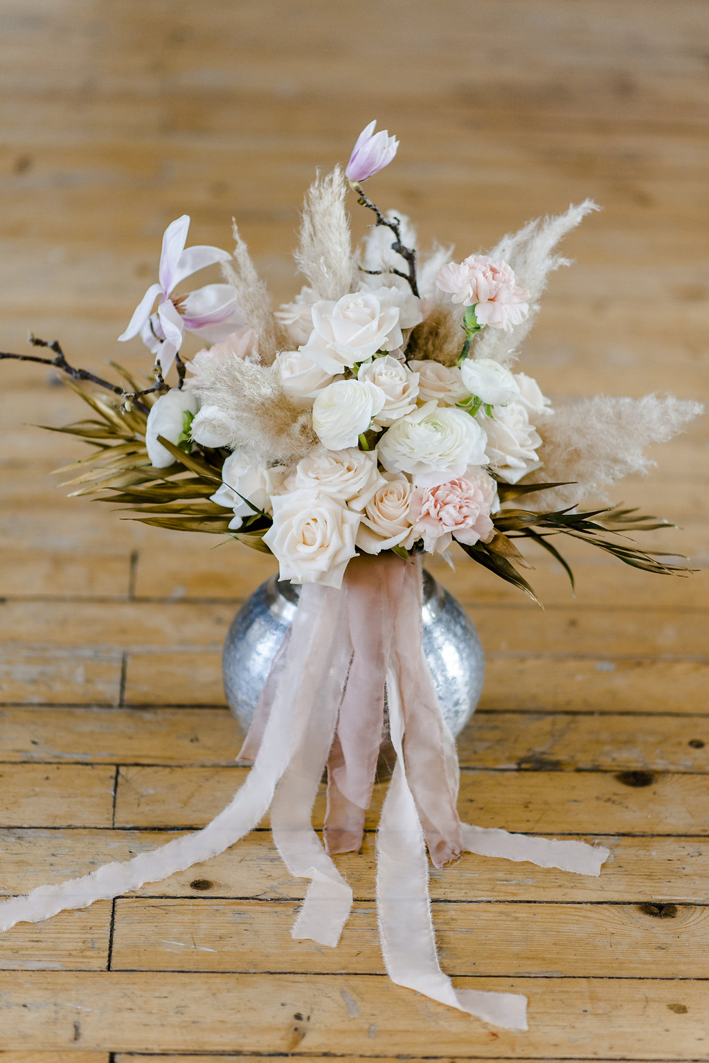 Farbnuancen in Rosegold, Nude, Natur, Gold, Silber, Schwarz und Magneta untermalen das sommerliche Ambiente. „Als Blumen hatten wir als Hauptelement die prachtvolle Magnolie gewählt, die zum Glück gerade noch am Blühen war, sowie nudefarbene Rosen, Nelken und weißen Lisianthus, begleitet von üppigem Pampasgras und gold besprühten Palmwedeln“, sagt die Braut.
